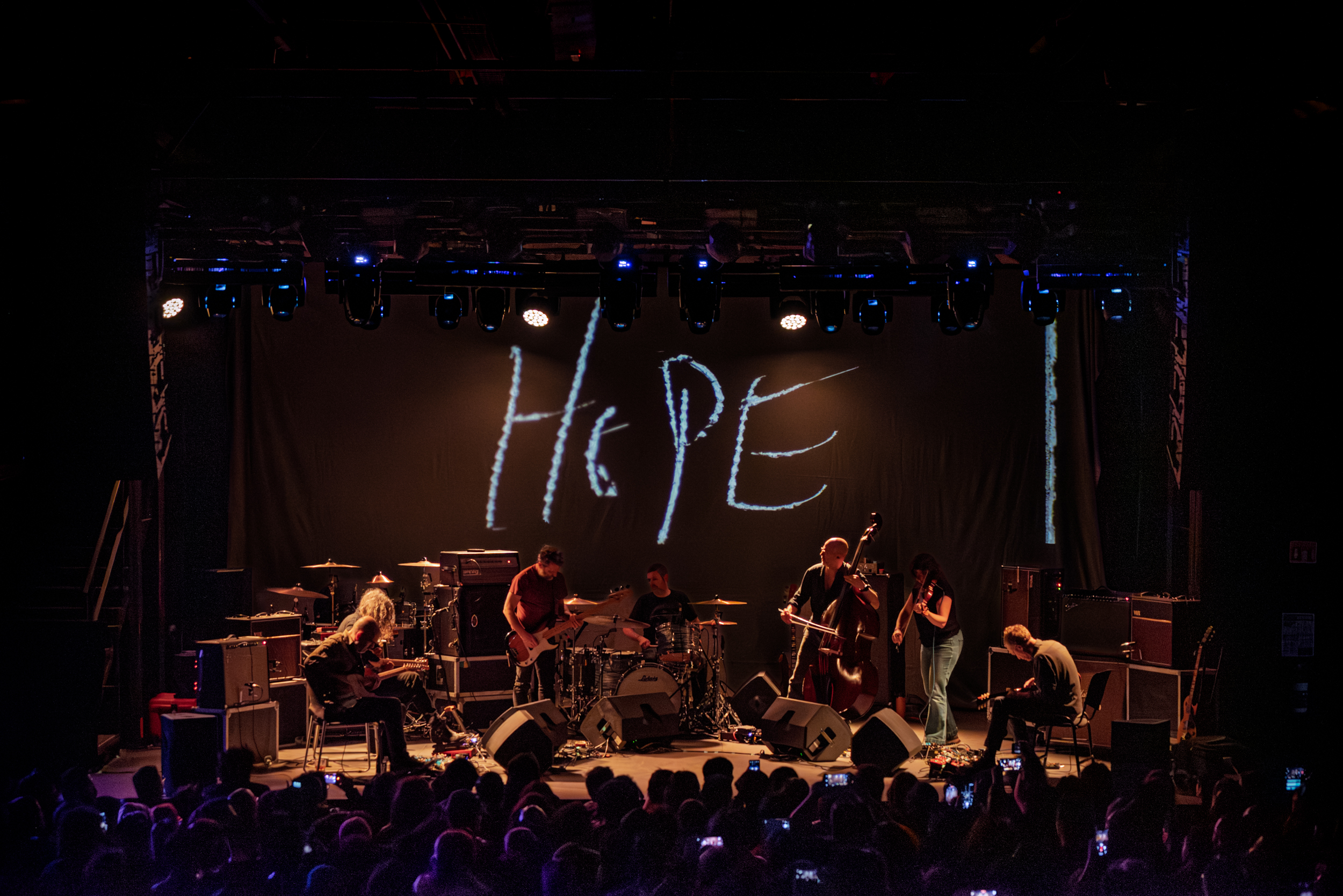 Cerca del final GY!BE tenía preparada una catarsis colectiva irrepetible con la fusión de “Bosses Hang” y “The Sad Mafioso” (un extracto del tema “East Hastings”), conformando un réquiem de estática y distorsión que no dejo a nadie indiferente, y que se sintió como una marcha triunfal hacia el fin de los tiempos. Una vez mas las proyecciones ganaban protagonismo emitiendo destellos de estructuras colapsando, mientras la música, se volvía más luminosa y expansiva. Esa sensación de que, a pesar de todo el caos exterior, todavía es posible construir algo monumental es algo que solo se puede experimentar en un concierto de estos pioneros del post rock.