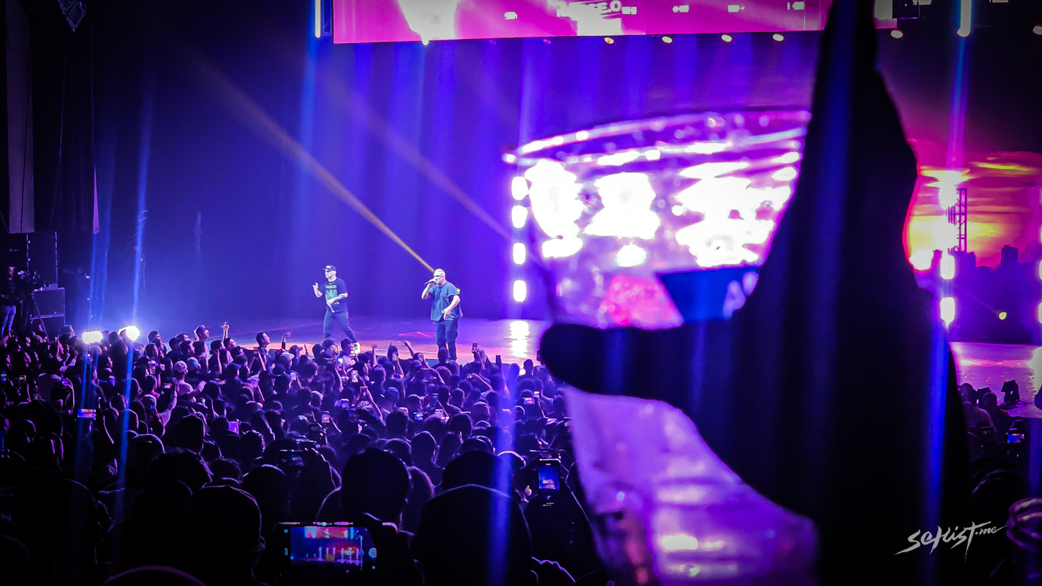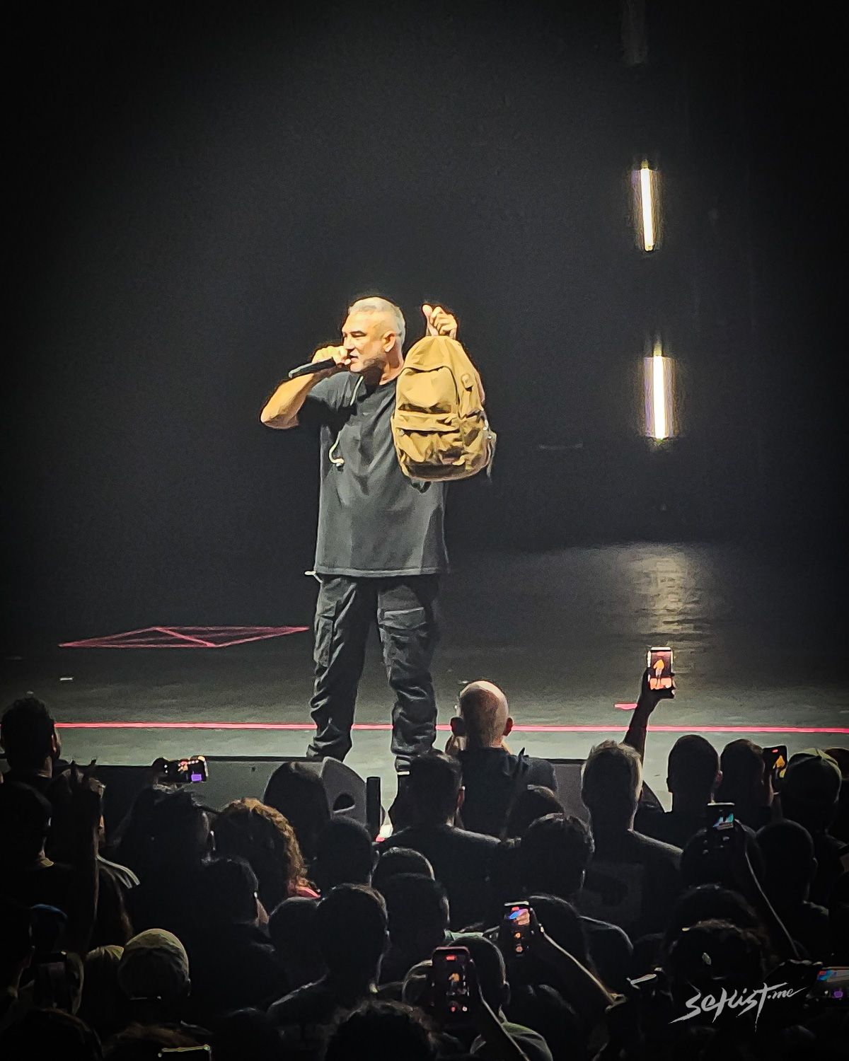 Desde la entrada se respiraba emoción. Las filas se extendían por todo el recinto mientras la gente se armaba con bebidas y snacks, listos para una noche épica. A las 9:16 p.m., tras la tercera llamada, Javier Ibarra Ramos, mejor conocido como Kase.O, apareció en el escenario con su mochila al hombro un guiño a sus inicios en el rap cuando, con 14 años, esa mochila le servía de almohada y estaba llena de sueños. Junto a él, su inseparable R de Rumba en las tornamesas.
