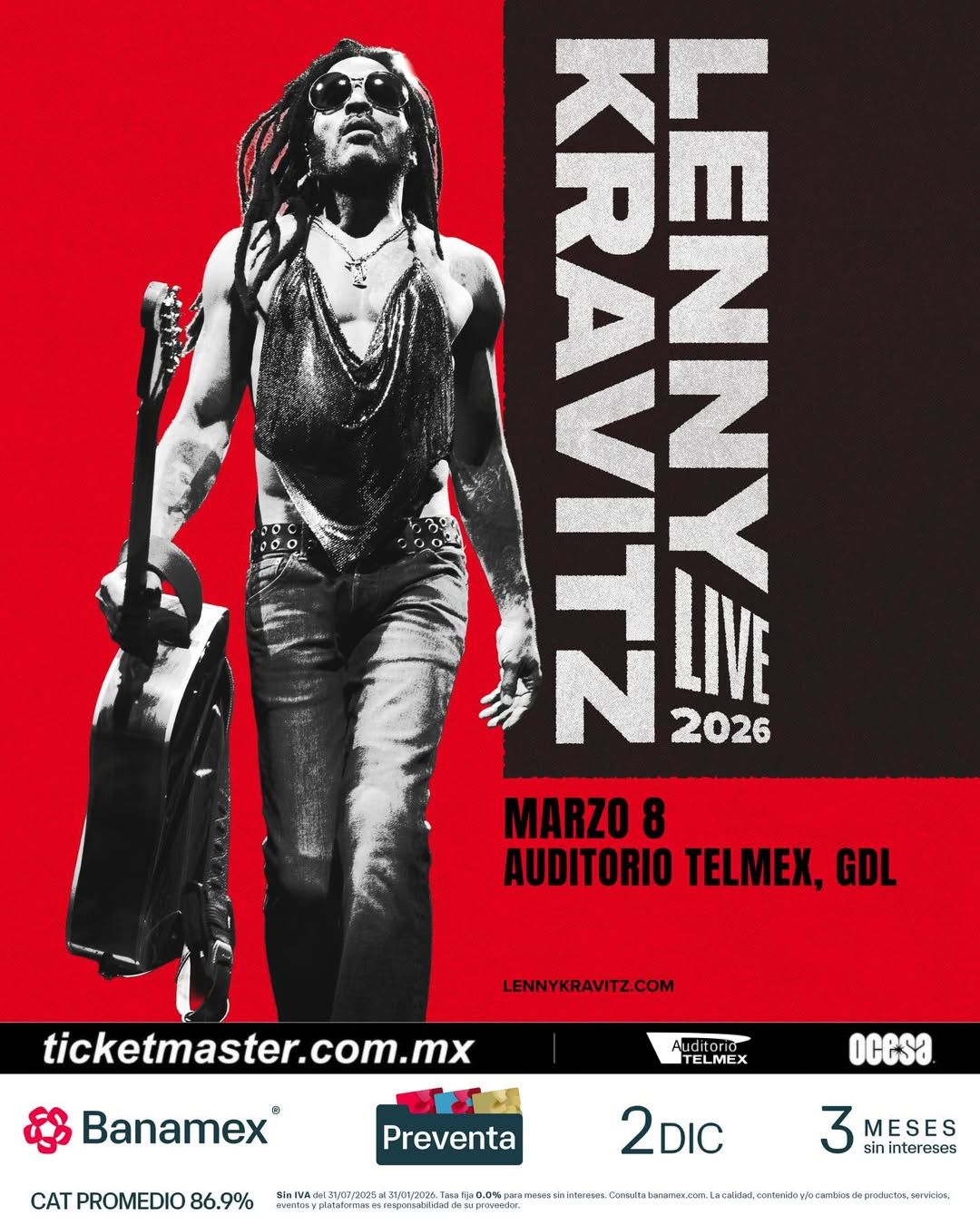 La gira incluirá shows principales y apariciones en festivales, llevando el aclamado espectáculo en vivo de Kravitz a fans de todo el mundo. Las entradas para Lenny Kravitz Live 2026, México, estarán disponibles durante la Venta Fans a partir del 27 de noviembre AQUÍ, así como en la Preventa Banamex, que se liberará el 2 de diciembre. La venta general iniciará el 3 de diciembre a través de Ticketmaster o en las taquillas de los inmuebles.