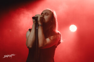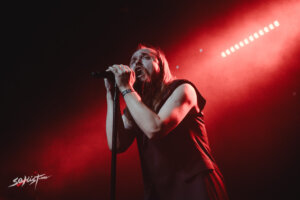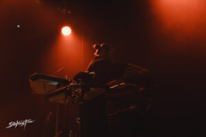 Minutos más tarde, en el momento en que Roman Komogortsev (guitarra, sintetizador, caja de ritmos) y Pavel Kozlov (bajo, sintetizador) bajaron al entarimado, la atmósfera se transformó, aunque si, la ovación más ruidosa tuvo lugar cuando apareció entre humo y sombras Egor Shkutko (vocales). Visualmente, la banda mantuvo su estilo distintivo, atuendos minimalistas en color negro y ese espíritu retro soviético complementaban el aura sombría del show. La presencia de Egor fue el centro de atención. Su figura, con ese look de «techno viking» que parece un sobreviviente de la fría Bielorrusia, desprendía un magnetismo único. Sus pasos de baile macabros, junto con su voz profunda y resonante, causaron muestras de emoción y asombro en el público tapatío, sobre todo cuando se bajo para acercarse a la valla e interactuar con los fans en primera fila.